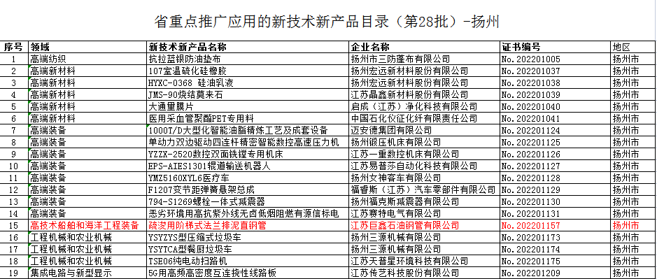 日前,江蘇省新技術(shù)新產(chǎn)品推廣應(yīng)用工作聯(lián)席會(huì)議辦公室公布了第二十八批省重點(diǎn)推廣應(yīng)用的新技術(shù)新產(chǎn)品簡(jiǎn)稱“兩新”)目錄,巨鑫鋼管“疏浚用階梯式法蘭排泥直鋼管”入選江蘇省重點(diǎn)推廣應(yīng)用的新技術(shù)新產(chǎn)品。